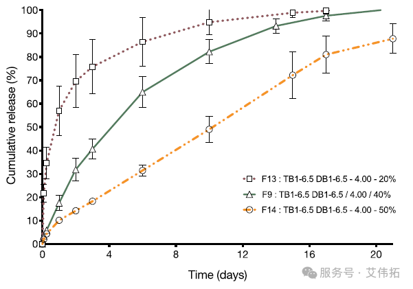 ·利用BEPO技術,通過調節配方中的參數如:DB和TB的組成、分子量及其相對比例,各共聚物中PEG和PDLLA的質量分數,或活性成分、聚合物與溶劑之間的相對比例等,可以調節多種藥物(包括大分子藥物)的釋放特性。