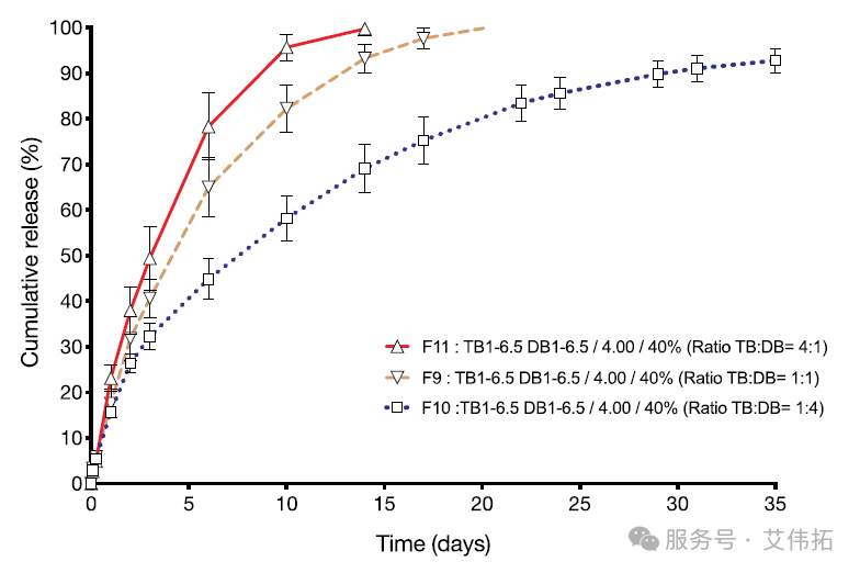 相同TB、DB組合,相同聚合物和活性成分含量,不同TB:DB比例制備的藥物儲庫中布比卡因的累計釋放量