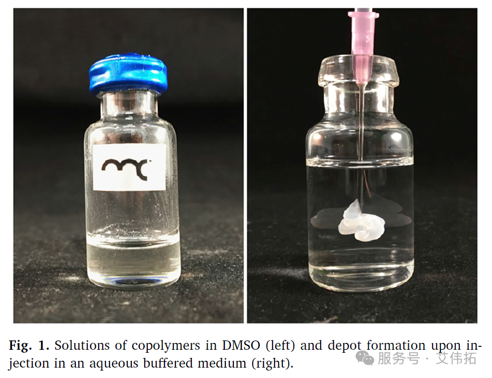 BEPO是一種基于溶劑交換(solvent-exchange)的原位凝膠技術(in situ forming depots, ISFD),與體液接觸后,體系內的溶劑擴散,而設計為不溶于水的聚合物則沉淀出來,從而實現對活性藥物成分的物理包封。下圖展示了共聚物在二甲基亞砜(DMSO)中的溶液注入緩沖介質后形成儲庫的過程。